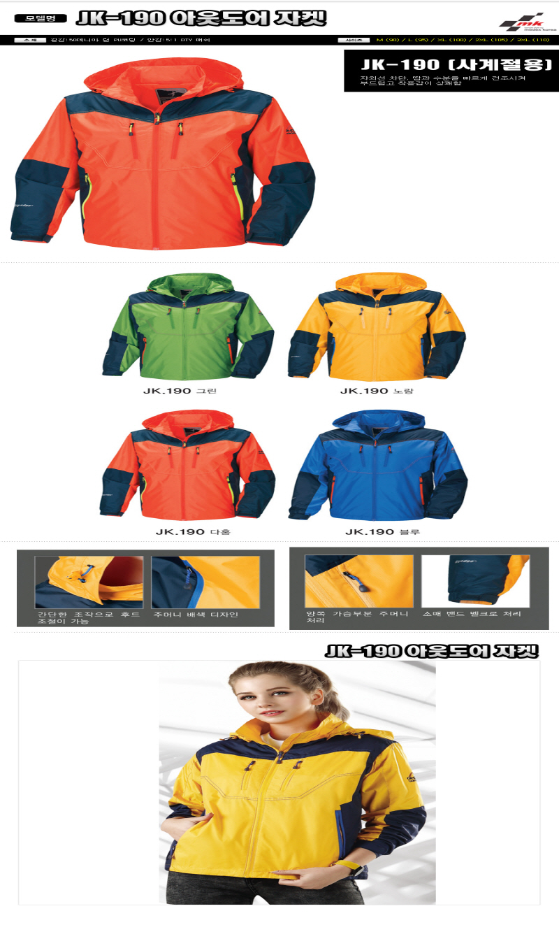 | 기타사항 | •Size : M, L, XL, 2XL, 3XL •소재 : 50데니아 립PU코팅/안감:5:1 DTY 매쉬 ※단가변동 있을 수 있습니다. 제품 색상은 인쇄된 것이므로 실제 제품과 다소 차이가 있을 수 있습니다. MC-190 |