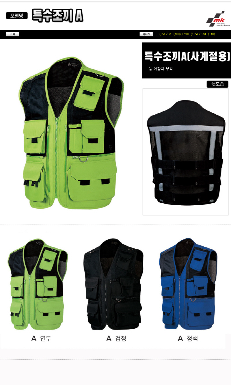 | 기타사항 | •Size : L, XL, 2XL, 3XL 등 야광띠 부착 ※단가변동 있을 수 있습니다. 제품 색상은 인쇄된 것이므로 실제 제품과 다소 차이가 있을 수 있습니다. |