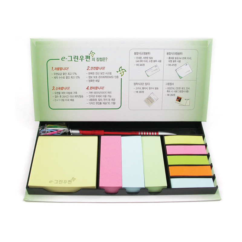 | 기타사항 | •케이스Size :220x120x22㎜ •점착메모지 70x76, 25x76㎜(3쪽) •형광오색(클립,볼펜포함) |