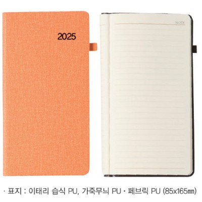 | 기타사항 | •노트, 일주일, 밴드부착 표지 : 이태리 습식 PU, 가죽무늬PU, 페브릭PU (85 x 165mm) |